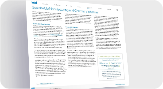 76 intel.com/responsibility 2021-22 Corporate Responsibility Report Sustainable Manufacturing and Chemistry Initiatives Two of our 2030 RISE technology industry initiatives focus on collaborations within our ecosystem to accelerate progress on reducing climate impact in semiconductor manufacturing and advancing sustain - able chemistry principles through the application of a chemical footprint methodology. Sustainable Manufacturing Intel is committed to contributing to the global effort toward science-based approaches to GHG emissions reductions in line with efforts to limit global warming to 1.5°C. However, we face challenges in gaining formal approval for an emissions-reduction target under the existing methodology of the Science-Based Targets Initiative (SBTi) due to a number of factors: First, the absolute contraction approach for setting science-based targets does not take into account early action to reduce absolute emissions. The convergence approach within SBTi's sectoral decarbonization approach (SDA) enables consideration of early action, but there is currently no SDA for the semiconductor industry. Second, demand for semiconductors is increasing, due in part to the role that technology plays in driving climate solutions. Current frameworks do not include consider - ation of the application of technology to reduce climate impact in global manufacturing. In addition, emissions pathways for non-CO 2 gases may differ from those for CO 2 due to differences in factors such as mitigation potential. Process emissions for the semiconductor manufacturing industry include non- CO 2 gases such as perfluorocarbons (PFCs) and nitrous oxide. Consideration of sector-specific differ - ences in emissions pathways for CO 2 and non-CO 2 GHG emissions is a potential area of importance for future research and for expanding opportunities for sector- specific approaches to targets. In 2021, we continued to work with industry stakeholders to assess the potential for the development of a sector- specific approach to setting science-based GHG emissions-reduction targets for the semiconductor manufacturing industry. The goal is to expand the number of companies in our sector setting science- based targets. Sustainable Chemistry Sustainable chemistry is a scientific concept that seeks to improve the efficiency with which natural resources are used to meet human needs for chemical products and services. Sustainable chemistry encompasses the design, manufacture, and use of efficient, effective, safe, and more environmentally benign chemical products and processes. Sustainable chemistry is also a process that stimulates innovation across all sectors to design and discover new chemicals, production processes, and product stewardship practices that will provide increased performance and value while meeting the goals of protecting and enhancing human health and the environment. 1 Our 2030 sustainable chemistry initiative is based upon the development and implementation of a chemical foot - print methodology to enable quantification of a baselines against which further progress can be measured, as well as to identify those chemical uses and processes for which significant improvements can be made. We intend to apply the chemical footprint methodology not only to Intel’s direct manufacturing operations, but also to integrate the methodology within the semicon - ductor manufacturing supply chain both upstream and downstream of our manufacturing operations. In 2021, Intel’s Sustainable Chemistry Team continued efforts to refine the chemical footprint methodology for use in evaluation of the chemical supply chain, as well as to integrate the methodology into the chemical supply chain to enable better assessment of full lifecycle impact. In addition, we continued to provide webinars to further the promotion of the chemical footprint meth - odology as a technology industry initiative. Sustainable chemistry baselines were completed for the current manufacturing technologies, as well as for the year 2020. We also completed an initial analysis of current chemical uses, and those identified as the highest impact chemistries have been included within a set of priority projects to further scope and disposition. In 2022, we plan to complete a proof of concept to enable visualization of the top impact chemical uses by mass and chemical footprint values, and to identify po - tential projects that will result in meaningful reductions in chemical footprint values. In addition, we will continue to actively participate in external chemical management initiatives geared toward the improvement of chemical management practices within our supply chain. Chemical Footprint Methodology Manufacturing Chemical Footprint = Mass of Chemical Used x Weighting Factors* For each chemical used, we have assigned a weighting factor from 1-4, with 4 representing the biggest impact. The methodology will also take into consideration the effectiveness of the control technology. *(reputation impact x expectation of regulation x human health factors x environmental impact x climate impact) 1 Source: OECD Sustainable Chemistry . Introduction Our Business Responsible Inclusive Sustainable Enabling Appendix
