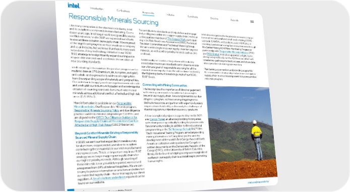 42 2021-22 Corporate Responsibility Report Responsible Minerals Sourcing Like many companies in the electronics industry, Intel and its suppliers use minerals in manufacturing. Over a dozen years ago, Intel began work to responsibly source conflict minerals, 1 and in 2017 we expanded our efforts to also address cobalt in our supply chain. We are proud of the significant progress we have made as a company and as an industry, but we know that there is more work to be done. A key technology initiative in our 2030 RISE strategy is to significantly expand our impact in responsible minerals and accelerate the creation of new sourcing standards. Intel’s strategy is to maintain the positive progress we’ve made to date on 3TG (tantalum, tin, tungsten, and gold) and cobalt, and to proactively address emerging risks from the expanding scope of materials and geographies. Our ambition is to apply our learnings from over a decade and work with our industry to broaden and accelerate the creation of sourcing standards for a much wider set of minerals across additional conflict-affected and high-risk areas (CAHRAs 2 ). More information is available on our Responsible Minerals website . Our Responsible Minerals program, Responsible Minerals Sourcing Policy , and due diligence practices address minerals originating in CAHRAs, and are aligned to the OECD Due Diligence Guidance for Responsible Supply Chains of Minerals from Conflict- Affected and High-Risk Areas (OECD Guidance). Beyond Conflict Minerals: Driving a Responsibly Sourced Mineral Supply Chain In 2021, we sent our first expanded minerals survey for aluminum, copper, nickel, and silver to suppliers contributing these materials in our Intel-manufactured microprocessors. This is an important step in our RISE strategy, as we begin mapping our supply chains for our highest priority minerals. Although sourcing of these minerals is not yet widely reported, we received a response from 89% of relevant suppliers. We are con - tinuing to pursue information on smelters and refiners in our extended supply chain—those that supply our direct suppliers. A list of smelters and refiners reported can be found on our website. To contribute to standards and help define and engage in due diligence within the copper supply chain, Intel is an active partner member of The Copper Mark , participat - ing in its Risk Readiness Assessment (RRA) Technical Revision Committee and Technical Working Group. We are continuing to map our supply chain for targeted minerals, as well as other priority minerals such as zinc and lead. Additionally, we continue to partner with industry associations to ensure standards are in place to enable our ultimate goal of responsible sourcing for all the minerals in our supply chain. We will continue to identify the highest priority minerals in pursuit of our 2030 RISE Goals. Connecting with Mining Communities Intel recognizes the importance of direct engagement with mining communities to address human rights issues in our supply chain. As a complement to our due diligence program, we have an ongoing program to dedicate resources and partner with expert civil society organizations to identify and remedy the challenges of the mining communities that source our products. A few examples of projects supported by Intel in 2021 are: Congo Power , an alliance providing mining areas with clean power, specifically funding the power needs for community training in addition to the educational programming at the Dr. Mukwege School ; PACT-RMI Youth Vocational Training Program, aimed at providing mining alternatives to Congolese youths; and the development of the world’s first Congo-focused North American collection and repository for Congolese- written documents on the Democratic Republic of the Congo (DRC), at the University of British Columbia library. We believe that helping to empower marginalized workers in our supply chain is a crucial step in promoting human rights. Intel also recognizes the local socio-economic impor - tance of the artisanal and small-scale mining (ASM) sector in CAHRAs and seeks to assist ASM sites in meeting downstream compliance requirements through the Better Mining ASM Mine Monitoring Program in partnership with Responsible Minerals Initiative (RMI) and RCS Global . Intel also supported a digital suite designed specifically for the ASM sector, which will create new pathways to track, access, and share data about practices in mining communities. Maintaining a connection and providing support to the communities that we depend on in our vast global supply chain is a crucial component to our responsible minerals program. Introduction Our Business Inclusive Sustainable Enabling Appendix Responsible intel.com/responsibility