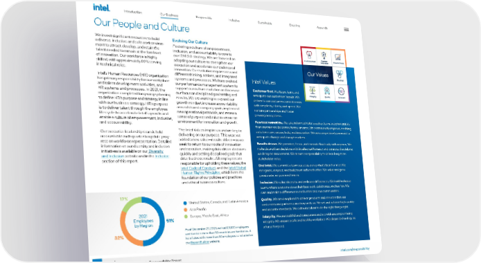 20 intel.com/responsibility 2021-22 Corporate Responsibility Report Our People and Culture We invest significant resources to build a diverse, inclusive, and safe work environ - ment to attract, develop, and retain the talent needed to remain at the forefront of innovation. Our workforce is highly skilled, with approximately 89% serving in technical roles. Intel’s Human Resources (HR) organization has primary responsibility for our workplace and talent development activities, and HR systems and processes. In 2021, the organization completed long-range planning to define HR’s purpose and strategy in line with our business strategy. HR’s purpose is to deliver talent through the employee life cycle to accelerate Intel’s growth and enable a culture of empowerment, inclusion, and accountability. Our executive leadership team is held accountable each quarter to update prog - ress on workforce representation. Detailed information on our diversity and inclusion initiatives is available on our Diversity and Inclusion website and in the Inclusive section of this report. Evolving Our Culture Fostering a culture of empowerment, inclusion, and accountability is core to our IDM 2.0 strategy. We are focused on adapting our culture to strengthen our execution and accelerate our cadence of innovation. Our evolution requires new and different thinking, actions, and integrated systems and processes. We have evolved our performance management system to support our culture evolution and increase our focus on disciplined goal setting and results. We are working to expand our growth mindset, increase accountability around shared company goals, implement new operational protocols, and renew a sense of purpose and value to create an environment for innovation and growth. The Intel Values inspire us and are key to delivering on our purpose. This year, we added a new value—results driven—as we seek to return to our roots of innovation and execution, making data-driven decisions quickly and setting disciplined goals that drive business results. All employees are responsible for upholding these values, the Intel Code of Conduct , and the Intel Global Human Rights Principles , which form the foundation of our policies and practices and ethical business culture. Intel Values Customer first. We listen, learn, and anticipate our customers’ needs. We deliver to our customer commitments with simplicity, clarity, and speed. We nurture partnerships and foster growing ecosystems. Fearless innovation. We take informed risks together, learn and pivot quickly from mistakes to be better, faster, smarter. We continuously improve, enabling us to be more curious, bold, and innovative. We are competitively paranoid to anticipate change and disrupt markets. Results driven. We prioritize, focus, and execute flawlessly with urgency. We make data-driven decisions with intellectual honesty and constructive debate; we disagree and commit. We assume responsibility to deliver long-term stakeholder value. One Intel. We commit to team success, doing what’s best for Intel. We recognize, respect, and build trust with each other. We value and grow passionate, empowered teams. Inclusion. We value diversity and embrace differences. We build inclusive teams where everyone does their best work, celebrates, and has fun. We care and make a difference to each other and our communities. Quality. We are disciplined to deliver products and services that our customers and partners can always rely on. We set and achieve high quality and security standards. We cultivate talent to do the right things right. Integrity. We are truthful and transparent and act with uncompromising integrity. We ensure a safe and healthy workplace. We shape technology as a force for good. As of December 27, 2021, we had 121,100 employees worldwide in more than 50 countries and territories. A list of sites with more than 50 employees is included on the Report Builder website. Asia Pacific United States, Canada, and Latin America Europe, Middle East, Africa 51% 32% 17% 2021 Employees by Region Introduction Responsible Inclusive Sustainable Enabling Appendix Our Business