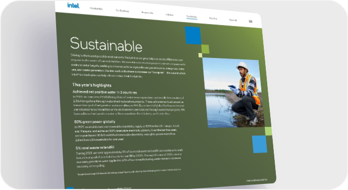 64 intel.com/responsibility 2021-22 Corporate Responsibility Report Sustainable Driving to the lowest possible environmental footprint as we grow helps us create efficiencies and respond to the needs of our stakeholders. We invest in conservation projects and set company-wide environmental targets, seeking to drive reductions in greenhouse gas emissions, energy use, water use, and waste generation. We also work with others to increase our “handprint”—the ways in which Intel® technologies can help others reduce their footprints. This year’s highlights Achieved net positive water in 3 countries In 2021, we conserved 9.3 billion gallons of water in our operations and enabled restoration of 2.3 billion gallons through watershed restoration projects. These achievements advanced us toward our goal of net positive water, resulting in 99% (by volume) of global fresh water treated and returned to communities or the environment and restored through watershed projects. We have achieved net positive water in three countries: the US, India, and Costa Rica. 80% green power globally In 2021, we maintained our renewable electricity supply at 100% in the US, Europe, Israel, and Malaysia, and achieved 80% renewable electricity globally. Over the last five years, we’ve purchased 30 billion kWh of renewable electricity, enough to power more than 2.8 million US households for one year. 1 5% total waste to landfill During 2021, we sent approximately 5% of our total waste to landfill and continue to work toward our goal of zero total waste to landfill by 2030. Through the end of 2021, circular economy practices were applied to 65% of our manufacturing waste streams via reuse, recovery, or recycling. 1 Based on average US household energy usage figures published by the US Energy Information Administration. Introduction Our Business Responsible Inclusive Sustainable Enabling Appendix