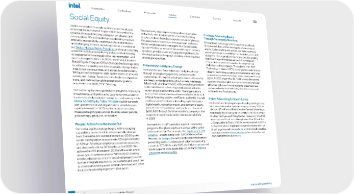 56 intel.com/responsibility 2021-22 Corporate Responsibility Report Social Equity Intel is committed to a culture of inclusion for all, and we recognize our shared responsibility to combat the structural inequalities impacting our employees and communities. We acknowledge accelerating equity is critical to successfully creating a culture of inclusion and belonging. At Intel, social equity is an extension of our Global Human Rights Principles and means creating a world in which all people, regardless of their identity or background, have equal voice, representation, and access to opportunities. In 2020, Intel established the Social Equity Program Office chartered to leverage data to address inequality and drive equitable change inside Intel, in our communities, and across broader society. We launched enterprise-wide sprint teams at all levels across our Human Resources and business organiza - tions, and defined tangible social equity goals to accelerate our 2030 RISE Strategy. Our social equity strategy includes programs, resources, investments, and policy advocacy to remove systemic barriers to a fully inclusive workplace and society. Intel’s Global Social Equity Policy Principles guide our work with governments and organizations to build a more equitable world. In 2021, we focused on creating measurable progress across four key areas: people, philanthropy, products, and policy. People: Action from the Inside Out Our social equity strategy begins with leveraging capabilities across Intel to drive equitable change from the inside out. Working toward our 2030 goals, we are taking action to accelerate US representation of African American employees at senior, executive, and director levels by 30% by the end of 2023. We achieved an 11% increase in 2021 and have set a mile - stone goal to achieve another 10% in 2022. Setting interim milestones ensures sustained progress as we further integrate equity into our systems and practices to close persistent gaps in African American and other inclusive leadership representation goals. Driving equity also requires personal transformation and action. Intel leaders continue to hold listening sessions to learn from lived experiences of employees. We also provide learning and engagement pathways for our employees and managers. Our Social Equity Speaker Series, an inclusive forum with expert external speakers, provides safe and supportive platforms for developing shared language and deeper learning from diverse perspectives. Philanthropy: Catalyzing Change Intel and the Intel Foundation are catalyzing change through strategic engagements and community partnerships. Recognizing that some issues of inequality are deeply embedded throughout society, Intel estab - lished multi-year investments with several organizations at the forefront of advancing social justice and anti- racism at scale around the world. The organizations were selected based on input from our Network of Intel African Ancestry and the Intel Black Leadership Council and focus on critical areas including equitable justice, digital equity, education equity, and economic equity. Intel, the Intel Foundation, and employees donated $600,000 through donation matching campaigns that supported social equity and justice causes globally in 2021. Intel and the Intel Foundation support community programs that place equity and access at the center of their offerings. For example, the Equity in STEAM initiative —a partnership with YWCA Metropolitan Phoenix—is designed to address the systemic barriers preventing women and people of color from pursuing careers in STEAM. In early 2022, the initiative announced funding grants and a leadership cohort for 20 Arizona educators and nonprofits . Products: Advancing Equity Through Technology Solutions We continue to leverage Intel’s expertise to unleash the power of data and technology to advance social equity. Collaborating with others, our data scientists and engineers are researching more inclusive, accessible designs for future products. Our teams are also working to prevent algorithmic bias as part of our focus on responsible AI practices and the development of inclusive coding language. Through the Intel RISE Technology Initiative (IRTI), our employees submit their ideas for technology projects in collaboration with Intel customers to positively impact social equity and human rights. In 2021, more than $1.4 million was directed to support innovative global projects at the intersection of human rights and social equity to expand access and opportunity for healthcare, digital inclusion, and economic and food security. Policy: Advocating for Social Justice Intel advocates for programs, public policy, and legislative solutions that combat systemic inequity. In early 2021, we pledged $5 million to North Carolina Central University, a historically Black college or university (HBCU), to create the first Tech Law and Policy Center. Today, only 5% of US attorneys are Black, even though more than 13% of the US population is Black. HBCUs are key to producing the next generation of legal and policymakers who will lead the charge to eradicate systemic and structural inequities. Intel also introduced expungement clinics to further our commitment to social equity. Introduction Our Business Responsible Sustainable Enabling Appendix Introduction Our Business Responsible Sustainable Enabling Appendix Inclusive Inclusive
