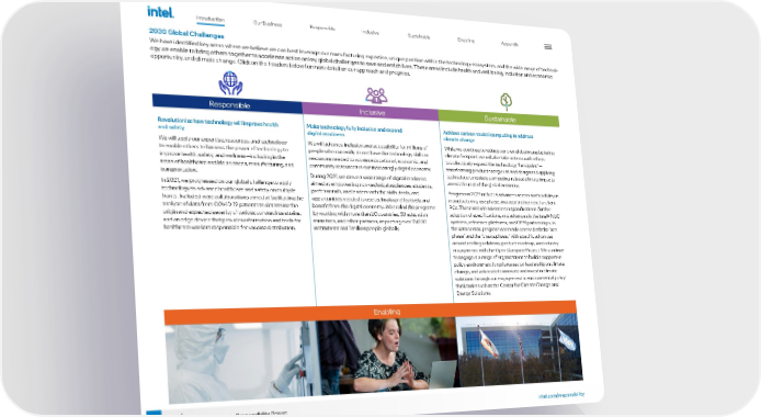 Our Business Responsible Inclusive Sustainable Enabling Appendix 10 intel.com/responsibility 2021-22 Corporate Responsibility Report Introduction 2030 Global Challenges We have identified key areas where we believe we can best leverage our manufacturing expertise, unique position within the technology ecosystem, and the wide range of technol - ogy we enable to bring others together to accelerate action on key global challenges to save and enrich lives. These areas include health and well-being, inclusion and economic opportunity, and climate change. Click on the headers below for more detail on our approach and progress. Responsible Inclusive Sustainable Revolutionize how technology will improve health and safety We will apply our expertise, resources, and technology to enable others to harness the power of technology to improve health, safety, and wellness—including in the areas of healthcare and life sciences, manufacturing, and transportation. In 2021, we progressed on our global challenge to apply technology to advance healthcare and safety on multiple fronts. Included were collaborations aimed at facilitating the analysis of data from COVID-19 patients to determine the origin and expected severity of various coronavirus strains, and an edge device that provides information and tools for healthcare workers responsible for vaccine distribution. Make technology fully inclusive and expand digital readiness We will advance inclusion and accessibility for millions of people who currently do not have the technology skills or resources needed to access educational, economic, and community resources in our increasingly digital economy. During 2021, we drove a wide range of digital readiness aimed at empowering non-technical audiences, students, professionals, and leaders with the skills, tools, and opportunities needed to use technology effectively and benefit from the digital economy. We scaled the programs by working with more than 20 countries, 50 education ministries, and other partners, impacting over 13,000 institutions and 1 million people globally. Achieve carbon neutral computing to address climate change While we continue to reduce our own global manufacturing climate footprint, we will also take actions with others to collectively expand the technology “handprint”— transforming product energy use and design and applying technology to reduce computing-related climate impacts across the rest of the global economy. Progress in 2021 included advances across sustainability in manufacturing, use phase, and asset retirement for client PCs. These include advances in specifications, further adoption of specifications, and advances in the Intel® NUC systems, reference platforms, and OEM partnerships. In the data center, progress was made across both the “use phase” and the “create phase,” with specific advances around cooling solutions, product roadmap, and industry engagement with the Open Compute Project. We continue to engage in a range of organizations to build a supportive policy environment for private sector leadership on climate change, and advocate to innovate and invest in climate solutions through our engagement in environmental policy think tanks such as the Center for Climate Change and Energy Solutions. Enabling