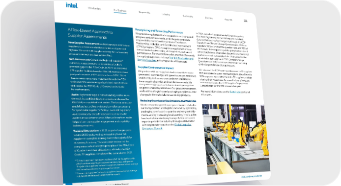 34 intel.com/responsibility 2021-22 Corporate Responsibility Report Recognizing and Rewarding Performance We provide regular feedback to suppliers on their overall progress and achievements, and integrate corporate responsibility considerations into our Excellence, Partnership, Inclusion, and Continuous Improvement (EPIC) program. EPIC recognizes suppliers that have demonstrated outstanding, distinguished, and valued performance. For more information and a list of recently recognized suppliers, visit our Top 100 Production and Service Suppliers in the Appendix of this report. Supplier Environmental Impact We partner with our suppliers to decrease their waste generated, water usage, and greenhouse gas emissions, and thereby reduce our own environmental impact, lower supply chain risk, and can decrease costs. We also partner with our tier 1 chemical and gas suppliers on green chemistry initiatives. Our procurement teams work with our logistics and packaging suppliers to drive changes in the materials we use to ship products. Reducing Greenhouse Gas Emissions and Water Use We decrease the greenhouse gas emissions related to our transportation and logistics network by optimizing packaging to reduce the quantity and weight of ship - ments, and by increasing local sourcing. Intel is at the forefront of standardizing transportation emissions reporting within the industry through collaboration with organizations such as the Global Logistics Emissions Council . In 2021, we asked approximately 116 tier 1 suppliers that have higher environmental impacts to submit data on their own carbon footprints through the CDP Supply Chain Climate Change Questionnaire. Of those suppliers, 99% submitted the questionnaire, and 92% of them made their responses public, giving both Intel and other stakeholders information about the environmental performance of our supply chain. Using information provided in our suppliers’ CDP Climate Change Questionnaire helps us ensure that we are focusing on the largest climate change impacts. We also sent the CDP water questionnaire to 52 suppliers that are located in water-stressed regions. We achieved a 98% response rate, with 94% of the 52 suppliers publicly sharing their responses. As a result of our efforts, we were recognized in the CDP Supplier Engagement Leaderboard for the fifth consecutive year. For more information, see the Sustainable section of this report. A Risk-Based Approach to Supplier Assessments New Supplier Assessment: A short survey is sent to new suppliers to determine whether a facility is of potential high risk. We work with suppliers during the on-boarding process to remedy any issues identified. Self-Assessment: Critical and high-risk suppliers 4 complete a questionnaire to determine a facility’s potential gaps to the RBA Code. In 2021, we assessed 374 supplier facilities based on this risk assessment and past performance, a 92% increase from 2020. 71% of these assessments were managed through the RBA tools and 29% were managed with Intel-specific tools while using the RBA Code of Conduct as the basis for conformance. Audit: Higher risk suppliers must undergo either an on- site audit by qualified third-party auditors who use the RBA VAP , or a qualified Intel auditor. The latter audits are specialized according to risk and compliance concerns for a particular supplier or facility. Lower risk suppliers, 5 as determined by the self-assessment, may also be audited at our determination. What we learn from audits helps inform our supplier engagement and capability- building programs. Training/Attestation: In 2021, as part of our progress toward 2030 goals, we began requiring lower risk suppliers to complete training classes through the RBA eLearning Academy. The curriculum instructed the companies on human rights principles of the RBA Code of Conduct and their obligation to abide by the RBA Code. 79 suppliers completed this curriculum in 2021. 4 “Critical suppliers” represent a subset of all tier 1 suppliers with which we have significant business relationships and spends. “High/er risk suppliers” refers to suppliers deemed above average risk, based on data and supplier performance. 5 “Lower risk suppliers” refers to suppliers deemed below average risk, based on data and supplier performance. Introduction Responsible Inclusive Sustainable Enabling Appendix Our Business