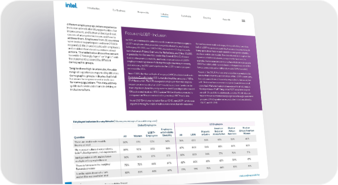 53 intel.com/responsibility 2021-22 Corporate Responsibility Report different employee populations experience inclusion at Intel, identify opportunities for improvement, and better understand root causes of any systemic issues and how to address them. Employees from 30 countries were invited to participate and over 27,000 responded. We shared results with employees and enabled them to ask questions about actions. The table below shows the percent favorable (“Strongly Agree“ or “Agree“ with the statement) as scored by different demographic groups. Despite these high-level results, the wide range of experiences reported by different demographic groups indicates that Intel has room for improvement in inclusion for some populations. This data will help guide our continued efforts in driving an inclusive culture. Employee Inclusion Survey Results (Shown percentage of favorable response) Global Employees US Employees Question All Women LGBT+ Employees Employees with Invisible Disability All URM Hispanic or Latinx American Indian or Alaska Native Black or African American Black or African American Women There are visible role models like me at Intel 80% 77% 52% 66% 74% 63% 66% 65% 56% 40% My manager values diverse talents, beliefs, backgrounds, and experiences 89% 90% 83% 86% 87% 86% 86% 85% 84% 80% Intel provides a safe and inclusive workplace for people like me 90% 90% 81% 81% 85% 83% 86% 77% 78% 71% There is fairness in the Insights/ Rewards process 72% 72% 66% 64% 62% 60% 63% 62% 54% 47% I can be open about who I am and still be successful at Intel 83% 83% 66% 69% 77% 75% 78% 66% 70% 61% Focus on LGBT+ Inclusion In 2021, we continued to cultivate a work environment that recognizes LGBT+ employee value, provides competitive benefits, and fosters belonging. IGLOBE, our LGBT+ ERG, expanded to 17 chapters, with new chapters in Poland, Germany, the Netherlands, and China. IGLOBE is guided by the Out and Ally Leadership Council (OALC) of senior leaders who promote visibility and focus on progression of LGBT+ employees and expansion of allyship through education, mentoring, and advocacy. In 2021, participation in the LGBT+ mentor program increased by 35%. Since 2002, the Human Rights Campaign (HRC) has listed Intel on its Corporate Equality Index (CEI), awarding Intel the top score of 100 in 17 of those years. The CEI recognizes employers that take steps to ensure greater equality for LGBT+ workers and their families in the form of policies, benefits, and practices. Intel Guadalajara also earned 100 points and received HRC Equidae MX Certification, awarded to companies in Mexico committed to providing LGBT+ inclusion. In our 2021 Employee Inclusion Survey (EIS), our LBGT+ employees reported strong favorable results in some areas, but also indicated that we have more work to do in psychological safety. Less than half of LGBT+ respondents said they had a positive experience in being open about their sexual orientation and gender identity, and have visible role models. The data allowed us to explore the dynamics of different identity groups for the first time; for example, the transgender community had a high belonging score (90% favorable), while our non-binary colleagues had one of the lowest scores related to visible role models (39% favorable). As part of the EIS, 5.1% of our employees that responded to the survey shared that they are a member of the LGBT+ community, but only one in three of those who responded to the survey has self-IDed in our human resources system (available in several countries). We have made progress educating employees on the importance of self-IDing, and in 2022, we plan to expand our self-ID capability to additional countries. We will also con - tinue to focus on retention and progression through our mentor program, OALC speaker series, and other initiatives driven by OALC and IGLOBE. Introduction Our Business Responsible Sustainable Enabling Appendix Introduction Our Business Responsible Sustainable Enabling Appendix Inclusive Inclusive