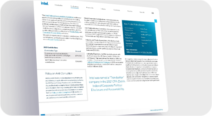 27 intel.com/responsibility 2021-22 Corporate Responsibility Report The Intel Political Accountability Guidelines outline our approach to making political contributions, including senior management and Board-level review processes and our commitment to transparency. Decisions on political contributions, whether from the Intel Political Action Committee (IPAC) or corporate funds, consider Intel’s business objectives, corporate policies, and the public policy priorities outlined on our Public Policy and Corporate Responsibility websites. We publish reports on our corporate contributions, IPAC contributions, and trade association membership dues on our Report Builder website. Direct Corporate Contributions. Intel makes relatively few direct political contributions using corporate funds, and has a policy of not making independent political expenditures or funding electioneering communications. Intel Political Action Committee. No corporate funds are contributed to IPAC other than for administrative purposes, and all employee participation in IPAC is voluntary. IPAC's approach targets balanced support of Democratic and Republican candidates each cycle. Industry and Trade Associations. We disclose trade association membership dues and payments to other tax-exempt organizations such as 501(c)(4) and 501(c)(6) organizations annually, including the reported portion of dues used for political purposes for annual dues over $50,000. Lobbying Expenses. Intel files quarterly reports with the Secretary of the US Senate and the Clerk of the US House of Representatives that detail our lobbying activities. These reports can be found in the Senate’s Lobbying Disclosure Act Database . In 2021, our reported lobbying expenditures totaled $4.1 million, compared to $3.6 million in 2020. We regularly evaluate our political spending for effective - ness and alignment as part of our contributions process. Decisions are made based on states and districts with a significant Intel presence and leadership on committees of jurisdiction on important Intel priorities. In response to stakeholder feedback, we have further enhanced our review process by adding reviews of public statements to better assess alignment with our values. When we identify some degree of misalignment, we communicate directly with contribution recipients. In cases of signifi - cant misalignment across our multiple key public policy issues, we take action to realign future funding decisions. Key Public Policy Issues Automotive and Transportation Customs and Trade Facilitation Digital Health Diversity and Inclusion Environment and Energy Global Trade Immigration Intellectual Property Privacy Security and Trust Spectrum Ta x More Information: Public Policy website and our P ublic Policy blog . 2021 Contributions Contribution Type Amount Corporate contributions, including state and local candidates, campaigns, and ballot propositions $216,000 Intel Political Action Committee contributions $396,000 Intel was named a “Trendsetter” company in the 2021 CPA-Zicklin Index of Corporate Political Disclosure and Accountability. Policy on Anti-Corruption Intel is committed to conducting business with integrity and adhering to applicable anti-corruption laws, including the US Foreign Corrupt Practices Act, the UK Bribery Act, and local anti-corruption laws in the locations where we do business. Our long-standing global anti-corruption program has robust governance mechanisms to ensure that our Policy on Anti-Corruption is followed by our employees and business partners, and that concerns are easily reported and quickly addressed. Introduction Responsible Inclusive Sustainable Enabling Appendix Our Business