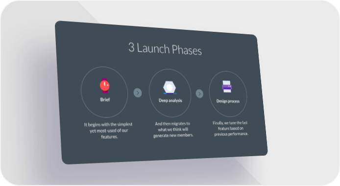 3 Launch Phases Brief Deep analysis Design process It begins with the simplest And then migrates to Finally, we tune the last yet most-used of our what we think will feature based on features. generate new members. previous performance.