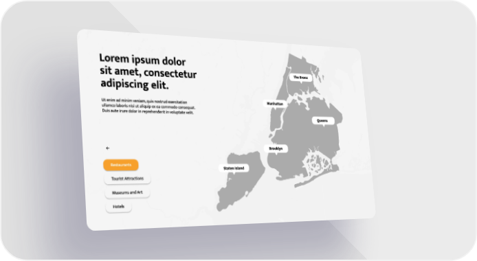 Lorem ipsum dolor The Bronx sit amet, consectetur adipiscing elit. Manhattan Ut enim ad minim veniam, quis nostrud exercitation ullamco laboris nisi ut aliquip ex ea commodo consequat. Duis aute irure dolor in reprehenderit in voluptate velit. Queens Brooklyn <- RReessttaauurraannttss Staten Island TToouurriisstt AAttttrraaccttiioonnss MMuusseeuummss aanndd AArrtt HHootteellss