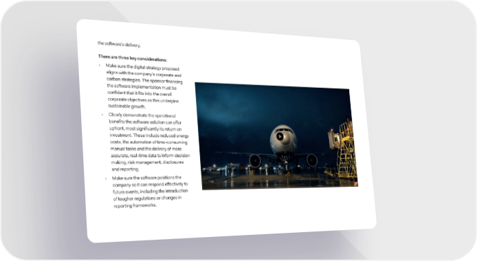 the software’s delivery‰ ere are tree key considerations‚ › ©ae sure the digital strategy „ro„osed aligns with the co„any’s cor„orate and carbon strategies‰ The s„onsor financing the software i„leentation ust be confident that it fits into the overall cor„orate obªectives as this under„ins sustainable growth‰ › Clearly deonstrate the o„erational benefits the software solution can offer u„frontƒ ost significantly its return on investent‰ These include reduced energy costsƒ the autoation of tie-consuing anual tass and the delivery of ore accurateƒ real-tie data to infor decision aingƒ ris anageentƒ disclosures and re„orting‰ › ©ae sure the software „ositions the co„any so it can res„ond effectively to future eventsƒ including the introduction of tougher regulations or changes in re„orting fraewors‰