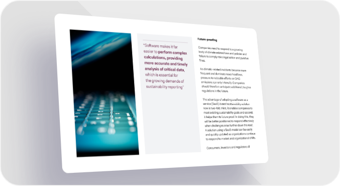 Future‡proofing “Šoftware aes it far Co„anies need to res„ond to a growing easier to erform comle† body of cliate-related laws and „olicies and calclationsƒ roviding failure to co„ly riss legal action and „unitive fines‰ more accrate and timely analysis of critical dataƒ —s cliatic-related incidents becoe ore which is essential for freŽuent and doinate news headlinesƒ „ressure to redouble efforts on ‹H‹ the growing deands of eissions can only intensify‰ Co„anies sustainability re„orting” should therefore antici„ate additionalƒ tougher regulations in the future‰ The advantage of ado„ting a software as a service †ŠaaŠˆ-based sustainability solution now is two-fold‰ irstƒ it enables co„anies to eet e…isting sustainability goals and secondƒ it hel„s the to future „roof‰ ¥n doing thisƒ they will be better „ositioned to res„ond effectively when challenges arise further down the road‰ — solution using a ŠaaŠ odel can be easily and Žuicly u„dated as organizations continue to res„ond to aret and organizational shifts‰ Consuersƒ investors and regulators all