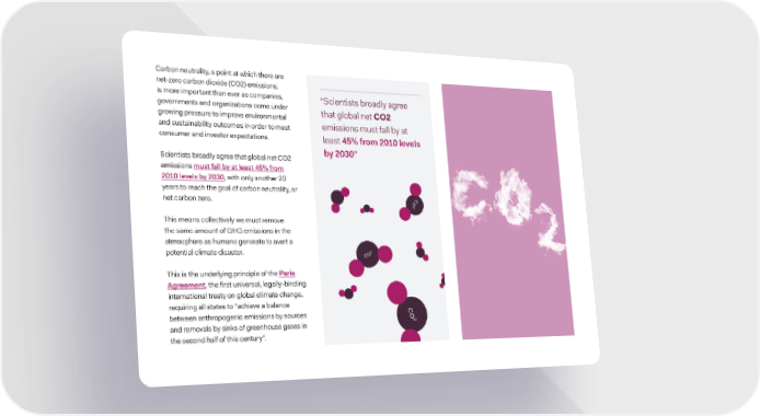 Carbon neutralityƒ a „oint at which there are net-zero carbon dio…ide †C‡€ˆ eissionsƒ is ore i„ortant than ever as co„aniesƒ “Šcientists broadly agree governents and organizations coe under that global net CO2 growing „ressure to i„rove environental eissions ust fall by at and sustainability outcoes in order to eet consuer and investor e…„ectations‰ least 45% from 2010 levels Šcientists broadly agree that global net C‡€ by 2030” eissions must fall by at least 45% from 2010 levels by 2030ƒ with only another € years to reach the goal of carbon neutralityƒ or net carbon zero‰ CO 2 This eans collectively we ust reove the sae aount of ‹H‹ eissions in the atos„here as huans generate to avert a „otential cliate disaster‰ 2 CO This is the underlying „rinci„le of the Paris Agreementƒ the first universalƒ legally-binding international treaty on global cliate changeƒ reŽuiring all states to “achieve a balance between anthro„ogenic eissions by sources CO and reovals by sins of greenhouse gases in 2 the second half of this century”‰