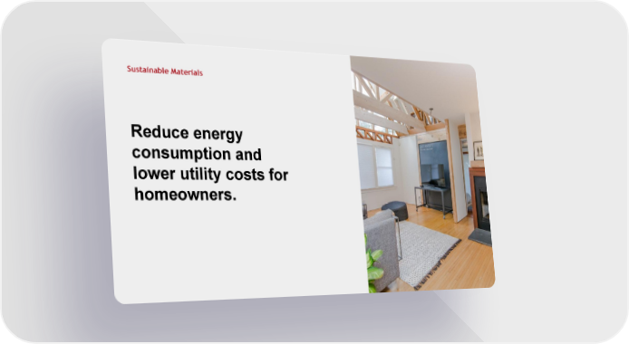Interactive Pitch Template Page 13 Page 15Sustainable Materials Reduce energy consumption and lower utility costs for homeowners.
