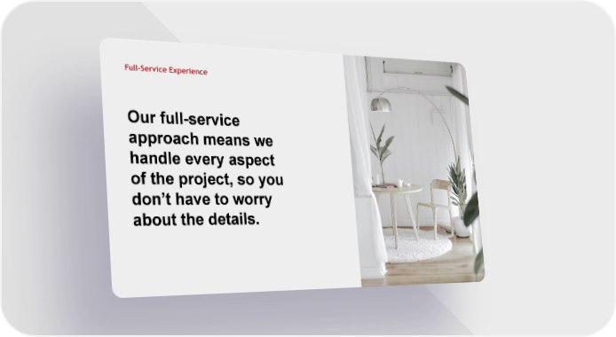 Full-Service Experience Our full-service approach means we handle every aspect of the project, so you don’t have to worry about the details.