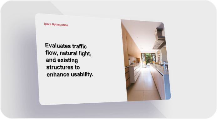 Space Optimization Evaluates traffic flow, natural light, and existing structures to enhance usability.