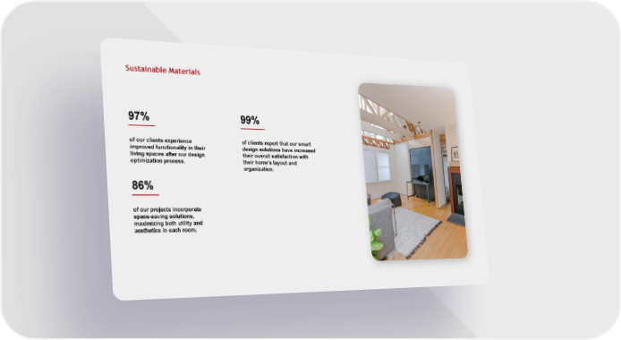 Sustainable Materials 86% of our projects incorporate space-saving solutions, maximizing both utility and aesthetics in each room. 97% of our clients experience improved functionality in their living spaces after our design optimization process. 99% of clients report that our smart design solutions have increased their overall satisfaction with their home's layout and organization.
