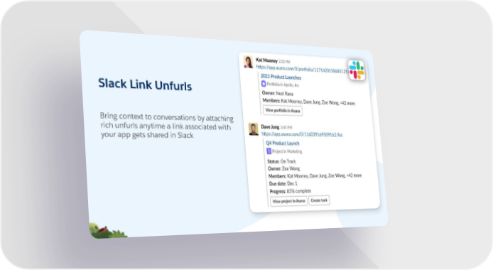 First level text is set at twenty point Salesforce Sans and does not have a bullet Slack Link Unfurls • Second level is eighteen point Salesforce Sans First level text is set at twenty point Salesforce Sans and does not have a bullet Bring context to conversations by attaching • Second level is eighteen point Salesforce Sans rich unfurls anytime a link associated with your app gets shared in Slack