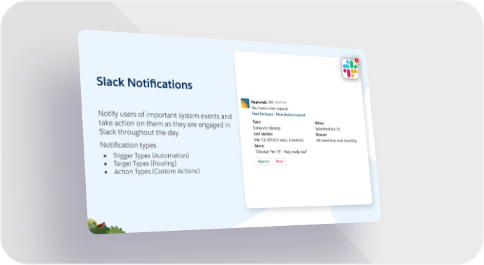 3 Slack Notifications Notify users of important system events and take action on them as they are engaged in Slack throughout the day. Notification types ● Trigger Types (Automation) ● Target Types (Routing) ● Action Types (Custom Actions)