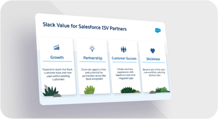 Slack Value for Salesforce ISV Partners Customer Success Growth Partnership Stickiness Create seamless Expand to reach the Slack Cross-sell opportunities Become part of the user’s experiences with customer base and new and potential for core workflow, reducing Salesforce and other users within existing partnership across the attrition risks integrated apps customers Slack ecosystem