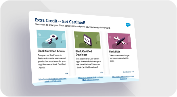 Extra Credit -- Get Certiļ¬ed! New ways to grow your Slack career skills and prove your knowledge to the world. https://www.slackcertified.com/page https://www.slackcertified.com/page https://www.slackcertified.com/page /slack-certified-admin /slack-certified-developer /slack-skills