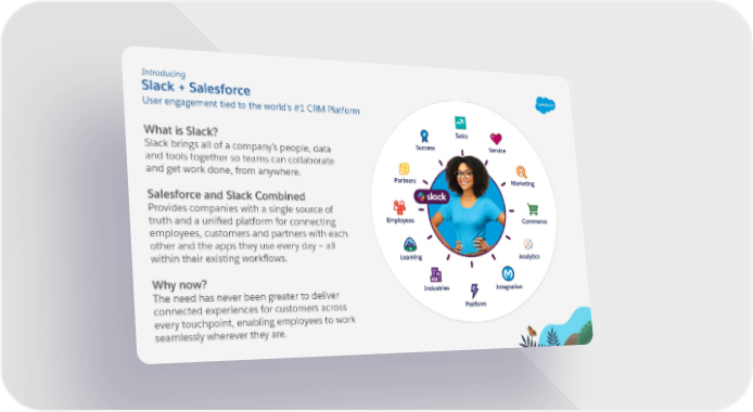 Introducing Slack + Salesforce User engagement tied to the world’s #1 CRM Platform What is Slack? Slack brings all of a company’s people, data and tools together so teams can collaborate and get work done, from anywhere. Salesforce and Slack Combined Provides companies with a single source of truth and a unified platform for connecting employees, customers and partners with each other and the apps they use every day – all within their existing workflows. Why now? The need has never been greater to deliver connected experiences for customers across every touchpoint, enabling employees to work seamlessly wherever they are.