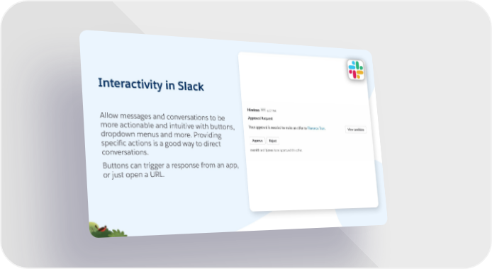 Interactivity in Slack Allow messages and conversations to be more actionable and intuitive with buttons, dropdown menus and more. Providing speciļ¬c actions is a good way to direct conversations. Buttons can trigger a response from an app, or just open a URL.