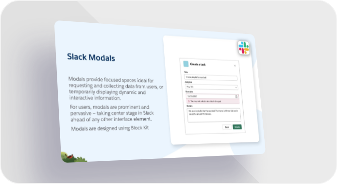 Slack Modals Modals provide focused spaces ideal for requesting and collecting data from users, or temporarily displaying dynamic and interactive information. For users, modals are prominent and pervasive — taking center stage in Slack ahead of any other interface element. Modals are designed using Block Kit