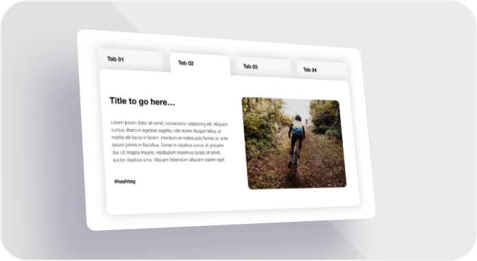 Tab 01 Tab 02 Tab 03 Tab 04 Е Title to go here… Lorem ipsum dolor sit amet, consectetur adipiscing elit. Aliquam cursus, libero in egestas sagittis, nibh lorem feugiat tellus, id mattis elit lacus in lorem. Interdum et malesuada fames ac ante ipsum primis in faucibus. Donec in dapibus purus, at posuere dui. Ut magna mauris, vestibulum maximus turpis sit amet, auctor dapibus urna. Aliquam bibendum aliquam sapien eget. #hashtag