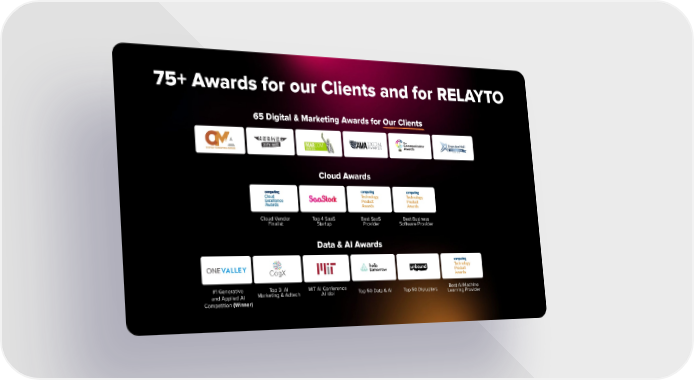 75+ Awards for our Clients and for RELAYTO 65 Digital & Marketing Awards for Our Clients RELAYTO AI powered platform has brought an entirely new approach to pursuits, by converting all sales content and any file type into a single immersive digital experience, which enables deal teams to connect and collaborate with customers, bring big ideas to life and differentiate Accenture from competition. Cloud Awards Cloud Vendor Top 4 SaaS Best SaaS Best Business Finalist Startup Provider Software Provider Data & AI Awards #1 Generative Top 3 AI MIT AI Conference Best AI/Machine Top 50 Data & AI Top 50 Disruptors Marketing & Adtech AI Idol Learning Provider and Applied AI Competition (Winner)