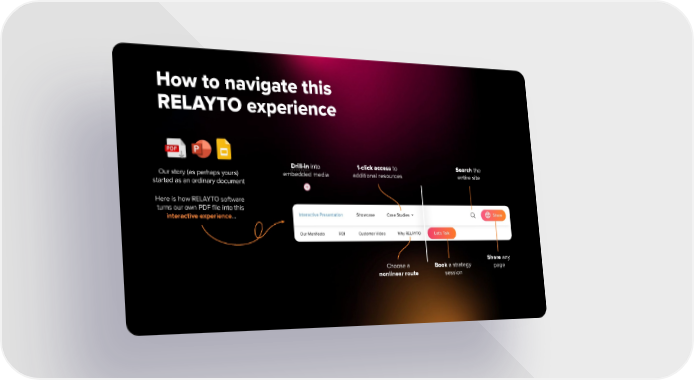 https://docs.google.com/presentatio n/d/1_zpDEEYUhTHOedEniHP_dN KoeP-Bvkv9Y3UMNYMMeso/edit#s lide=id.gde52b55b26_4_818 How to navigate this RELAYTO experience Slide Scroll Full Screen Drill-in into 1-click access to Search the Our story (as perhaps yours) embedded media additional resources entire site started as an ordinary document Here is how RELAYTO software turns our own PDF file into this interactive experience... Share any Choose a Book a strategy page nonlinear route session Experience Is the Message Turn PDFs & Presentations into Digital Experiences