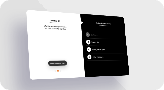 Question 2/3 Select Answer Below What type of engagement can you view in Relayto analytics? By Person A Page visits B Average time spent C All of the above D Learn About the Topic