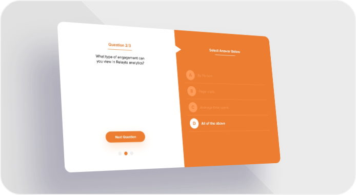 Interactive Quiz Template — Google Slides, PowerPoint & PDF Page 10 Page 12Question 2/3 Select Answer Below What type of engagement can you view in Relayto analytics? By Person A Page visits B Average time spent C All of the above D Next Question