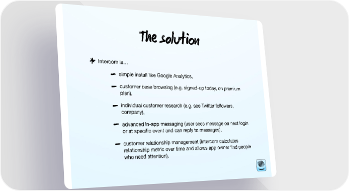 T solu * Intercom is… - simple install like Google Analytics, - customer base browsing (e.g. signed-up today, on premium plan), - individual customer research (e.g. see Twitter followers, company), - advanced in-app messaging (user sees message on next login or at specific event and can reply to messages), - customer relationship management (Intercom calculates relationship metric over time and allows app owner find people who need attention).