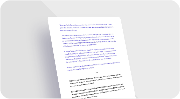 When people think about their competitors they tend to look at what’s closest to home. If I run a pizza slice store, and you run a McDonalds, we must be competitors, right? But real competition is usually a playing field away. Jobs-to-be-Done gives you a much better lens to think about your true competitors. It gives you the situational context that triggers people to use products. To use the above example, if I know my customers are choosing my pizza because they only have five minutes to spare, and need to eat while walking to a meeting, then I know my competitor isn’t McDonalds. I’m really competing with a Snickers bar and the hot dog cart around the corner. When you’re blinded by thinking your competitors only exist in the exact same tool catego- ry you’re in, disruption or destruction will come from oblique angles. The newspaper industry thought they were in the business of selling news printed on paper. Had they realized their business was “keep people entertained”, or “keep people in the know”, their new competitors like mobile games, Twitter, and Facebook would have been a more obvious threat. So when you’re thinking about competitors, it’s best to ignore product categories and instead ask yourself who else is fighting for that same job. • • • Sometimes your customers really want to use your feature or product, but they also want some- thing else that simply isn’t compatible with it. People really want to be slim and healthy, but they also really want soft drinks and fast food. McDonalds and Weight Watchers are selling wildly different products, but they’re competing for the same customers. This is what we call indirect competition. Note this is different to competing on outcomes. Video conferencing and business class flights compete on outcomes, as they’re both hired for the same job – business meetings. 11