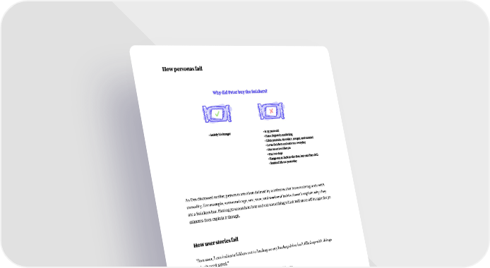 How personas fail As Des discussed earlier, personas are often defined by attributes that have nothing to do with causality. For example, someone’s age, sex, race, and weekend habits doesn’t explain why they ate a Snickers bar. Having 30 seconds to buy and eat something which will stave off hunger for 30 minutes does explain it though. How user stories fail “As a user, I can indicate folders not to backup so my backup drive isn’t filled up with things I don’t need saved.” User stories, such as the one above, have three big problems: 1. They use personas. 2. They couple implementation with motivations and outcomes. 3. They ignore context, situations and anxieties. Features fail often. If a feature was defined by a user story, discovering why it failed will be difficult, because implementation was coupled with motivations and outcomes. Because of the coupling, how can anyone know what was wrong? Was the implementation wrong, or were the assumptions about the motivations wrong? 38
