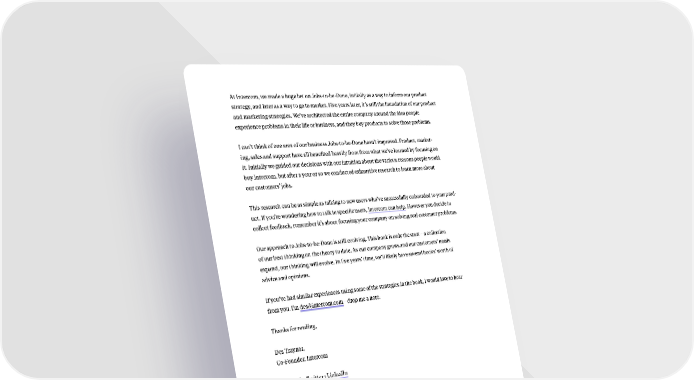 At Intercom, we made a huge bet on Jobs-to-be-Done, initially as a way to inform our product strategy, and later as a way to go to market. Five years later, it’s still the foundation of our product and marketing strategies. We’ve architected the entire company around the idea people experience problems in their life or business, and they buy products to solve those problems. I can’t think of one area of our business Jobs-to-be-Done hasn’t improved. Product, market- ing, sales and support have all benefited heavily from from what we’ve learned by focusing on it. Initially we guided our decisions with our intuition about the various reasons people would buy Intercom, but after a year or so we conducted exhaustive research to learn more about our customers’ jobs. This research can be as simple as talking to new users who’ve successfully onboarded to your prod- uct. If you’re wondering how to talk to specific users, Intercom can help. However you decide to collect feedback, remember it’s about focusing your company on solving real customer problems. Our approach to Jobs-to-be-Done is still evolving. This book is only the start – a collection of our best thinking on the theory to date. As our company grows and our customers’ needs expand, our thinking will evolve. In five years’ time, we’ll likely have several books’ worth of advice and opinions. If you’ve had similar experiences using some of the strategies in the book, I would love to hear from you. I’m des@intercom.com – drop me a note. Thanks for reading, Des Traynor, Co-Founder, Intercom Facebook • Twitter • LinkedIn 49