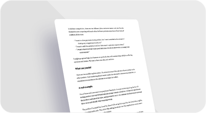In indirect competition, there are two different jobs a customer wants to do, but the jobs themselves are competing with each other. Software products experience these types of conflicts all the time: · “I want to allow payments in my product, but I want to minimize the amount of third-party integrations we rely on.” · “I want to add this analytics tool, but I also want to optimize response times.” · “I want to know how my team spend their time, but also to show we’re a trusting work environment.” It might go against logic, but humans are perfectly okay with maintaining multiple conflicting opinions and desires. We want to have our cake, and eat it too. What can you do? There are two conflicting forces here. The attractiveness of the outcome of your product vs the other product. Your marketing should work to make the alternative outcome less attractive, or reposition your product so the outcome is no longer in conflict. A real example One of Intercom’s customers was perplexed. Hundreds of companies had signed up for his A/B testing product, but very few had taken the plunge beyond a trivial test. Yet they all wanted to use the product, understood its value, and knew how to use it. Our customer used Intercom to message these users and identify what was going wrong. The problem? As much they loved the idea of A/B testing their app, they also loved clean, legible, and maintainable code. They didn’t like adding JavaScript into their application to create mean- ingful tests, so they didn’t use the product. To address these concerns, he added a message schedule downplaying the importance of clean code and upselling his product. He sent the following message to non-users on day three: “If no one is using your product, who cares how clean your code is?” On day seven, he sent another well-timed message: “This morning your team can add more code, or add more customers. Which do you want?” These messages were effective. Many resulted in installs. Some resulted in technical debates. But most importantly, all of them produced extra insights into their business, which is what you need when you’re starting out. The point is, customers don’t experience your product in a vacuum. They experience it alongside every other product, service, and idea fighting for their attention. Some of these will compete with your brand and some will contradict it. Understanding all these forces helps you counter them with your marketing efforts. 12