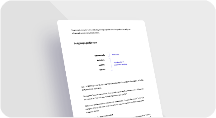For example, consider how a team might design a profile view for a product that helps car salespeople secure loans for customers. Designing a profile view Early in the design process, the team was discussing what the profile would look like, and what features should exist there. At one point Sara, a team member, stood up and drew a simple wireframe on the whiteboard. She pointed to a box and said, “This is the salesperson’s profile”. The team is not immediately convinced by her rationale. They asked a series of “whys” for each part of the profile view. Even after all of these questions, the team didn’t coalesce for or against the idea. At this point, the question was asked: “Why should the product have a profile view? Why should it be in one place or another? What in- formation should it display? What situations is it resolving? What job is this profile view doing?” To resolve this, the feature was reframed through Job Stories. Start with the high level job The product’s high level job is to help a car salesperson secure a loan for prospective customers. Currently, the customer and the salesperson have to fill out a lot of difficult paperwork. Identify a smaller job which helps resolve the high level job In order to fill the loan application out correctly, the salesperson and customer need to enter 40