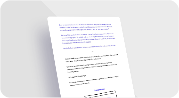 Most products are obsessed with the intricacies of their own categories. Weather apps focus on precipitation depths, air pressure, and all sorts of forecasts no one really cares about. Their users are usually trying to answer simple questions like “will it rain?” or “how warm will it be?” We learned this one the hard way in Intercom. After we launched our maps feature, it proved dis- proportionately popular. We couldn’t work out exactly why, but we were happy to see the engage- ment regardless. It turns out people were using the feature for a very specific job, one we had total- ly stumbled into and certainly didn’t design it for. Paradoxically, to make it a better feature we made it a worse map. And we learned a lot from that. • • • Customers will always surprise you with the creative ways they use your product. They don’t do it deliberately – they’re just adapting your product to their needs. Remember the earlier Peter Drucker quote about customers rarely buying what the company is selling? The implication is to improve a product you must first understand what it is being used for. Let’s explain with an example. Not long after we launched Intercom, we added a map feature, so you could see where your customers were around the world. It was a classic “this is cool but we don’t know why” type of feature. And its traffic showed us that it became popular quickly. But marketing the map as a feature was difficult. It was hard to work out why you’d use it. 29