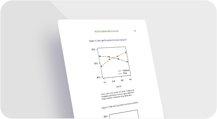 INTERNETRISING,PRICESFALLING 13 Figure3: Entryratebyproductrevenueandprice 60% ● ● ● ● ● ● 50% ● ● Revenue 40% Price 1st 2nd 3rd 4th Quartile Notes: Entry rates are for 2015–2016. Products are sortedintoquartilesbyrevenueorpricewithinELIs. Source: Authors’calculationusingAdobedata. Figure4: Exitratebyproductrevenueandprice 60% ● 50% ● ● ● ● ● ● 40% ● Revenue 30% Price 1st 2nd 3rd 4th Quartile Notes: Exit rates are for 2015–2016. Products are sortedintoquartilesbyrevenueorpricewithinELIs. Source: Authors’calculationusingAdobedata.