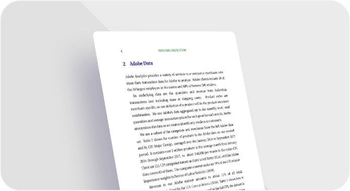 4 GOOLSBEEANDKLENOW 2 AdobeData Adobe Analytics provides a variety of services to e-commerce merchants who share their transaction data for Adobe to analyze. Adobe clients include 20 of the30largestemployersinthenationand80%ofFortune500retailers. Its underlying data are the quantities and revenue from individual transactions (not including taxes or shipping costs). Product codes are merchant-specific,soourdefinitionofaproductwillbetheproduct-merchant combination. We use Adobe’s data aggregated up to the monthly level: total quantitiesandaveragetransactionpricesforeachgoodforeachmonth. Adobe anonymizesthedatasowecannotidentifyanyretailersorcustomers. Weuseasubset of the categories and merchants from the full Adobe data set. Table 2 shows the number of products in the Adobe data we use (overall and by CPI Major Group), averaged over the January 2014 to September 2017 period. It contains over 2 million products in the average month from January 2014 through September 2017, vs. about 140,000 per month in the entire CPI. Thereare211CPIcategoriesknownasEntryLevelItems(ELIs),andtheAdobe datacovers65ofthem. Thecategoriescoveredmakeup19%oftheCPIrelative importanceweightsinBureauofLaborStatistics(2018). Revenue in our Adobe dataset amounts to about 15% of all retail e-commercetabulatedbytheU.S.CensusBureau(2018). Table3showshowit is distributed across CPI Major Groups. ComparedtothefullCPI,thedatasetis definitely tilted toward tangible goods like appliances, furniture, clothing, electronics, and toys. Within some broad CPI categories, it covers only certain typesofproducts. WithinHousing,forexample,theAdobedatadonotinclude rent or owner’s equivalent rent, only specific products hence we label them “Household Goods.” Similarly, we refer to “Information Technology” as the goodswithinEducationandCommunicationthattheAdobedatacovers.