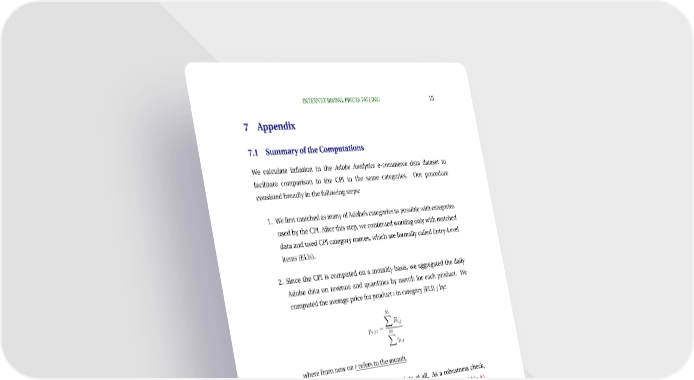 INTERNETRISING,PRICESFALLING 15 7 Appendix 7.1 SummaryoftheComputations We calculate inflation in the Adobe Analytics e-commerce data dataset to facilitate comparison to the CPI in the same categories. Our procedure consistedbroadlyinthefollowingsteps: 1. WefirstmatchedasmanyofAdobe’scategoriesaspossiblewithcategories usedbytheCPI.Afterthisstep,wecontinuedworkingonlywithmatched data and used CPI category names, which are formally called Entry-Level items(ELIs). 2. Since the CPI is computed on a monthly basis, we aggregated the daily Adobe data on revenue and quantities by month for each product. We computedtheaveragepriceforproductiincategory(ELI)j by: 30 XR i,j pi,j,t = 30 Xqi,j wherefromnowontreferstothemonth. 3. For our baseline we do not trim the data at all. As a robustness check, wegaugetheeffectoftrimmingonthepricelevel. AsshowninTableA1, trimmingonthepricelevelhaslittleeffectonAdobeinflationrates. 4. Next, to compute the price index for every ELI at a given month, we first find the products which were sold both in the last and present month (adjacentproducts). 5. Again, our baseline does not trim at all. But Table A1 shows robustness to trimmingonextremepricechangeswithinELI’s.