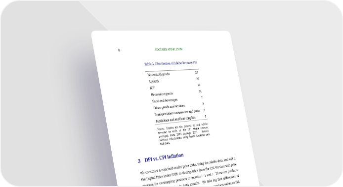 6 GOOLSBEEANDKLENOW Table3: DistributionofAdobeRevenue(%) Householdgoods 27 Apparel 27 ICT 19 Recreationgoods 14 Foodandbeverages 7 Othergoodsandservices 3 Transportationaccessoriesandparts 2 Medicinesandmedicalsupplies 1 Notes: Entries are the percent of total Adobe revenue in each of the CPI Major Groups, averaged from 2014 through 2017. Source: Authors’ calculations using Adobe Analytics and BLSdata. 3 DPIvs.CPIInflation Weconstruct a matched-model price index using the Adobe data, and call it the Digital Price Index (DPI) to distinguish it from the CPI. We start with price changes for overlapping products in months t−1 and t. These are products selling positive quantities in both months. We take log first differences of average unit prices. To aggregate price changes across products within an ELI, weuseTornqvistweights. Thesearetheaveragespendingshareoftheproduct in the ELI in months t−1 and t. The spending shares are based on Adobe data 2 for overlappingproducts. Tofacilitate comparison with the CPI, we aggregate the Adobe ELI inflation ratesusingtheCPIrelativeimportanceweightsforeachELI-month. Weusethe samesetofELIstoconstructbothourcomparisonCPIandtheDPI.Inthisway 2Like the BLS, we do something special for apparel. We construct a simple index of average unitprices. Thisistoavoidextremedeflationfromfashionandseasonalcyclesforclothing.