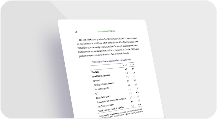 14 GOOLSBEEANDKLENOW ThevitalrolefornewgoodsintheAdobeonlinedatacallsformoreresearch on new varieties in traditional retail, preferably outside of just the items with 8 UPCcodesthataremostly confined to food, beverages, and drugstore items. If offline sales are similar to online sales, as suggested by Cavallo (2017), new productsmaybeevenmoreimportantthanpreviouslythought. Table7: NewGoodsBiasBasedontheAdobeData σ = 4 σ = 6 Headline 3.5 2.1 Headlineex.Apparel 2.5 1.5 Apparel 7.3 4.4 Othergoodsandservices 5.9 3.9 Recreationgoods 5.4 3.2 ICT 4.1 2.5 Householdgoods 0.9 0.5 Transportationaccessoriesandparts 0.7 0.4 Foodandbeverages 0.4 0.2 Medicinesandmedicalsupplies 0.0 0.0 Notes: Entries are percentage points per year, averaged over 2014– 2015and2015–2016. Source: Authors’calculationusingAdobedata. 6 Conclusion Using a new dataset on e-commerce transactions in many categories of goods fromAdobeAnalytics,wecalculatedmatched-modelinflationandexploredthe importanceofnewproducts. Combiningthetwo,thetrueAdobeDPIinflation rate — adjusted for new goods — was more than 3 percentage points per year lowerthantheCPIinflationrateforthesamecategoriesfrom2014–2017. 8Aghionetal.(2017)studytheentirenonfarmbusinesssector,butonlyattheestablishment level rather than at the detailed product level.