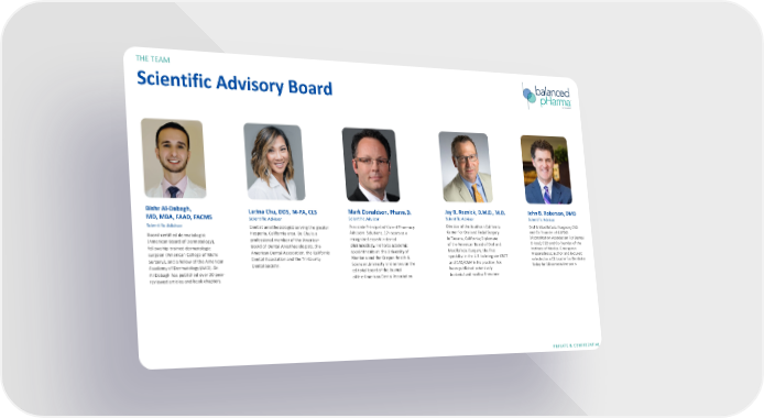 THE TEAM Scientific Advisory Board Bishr Al-Dabagh, Larina Chu, DDS, M-PA, CLS Mark Donaldson,Pharm.D. Jay B. Reznick, D.M.D., M.D. John B. Roberson, DMD MD, MBA, FAAD, FACMS Scientific Advisor Scientific Advisor Scientific Advisor Scientific Advisor Scientific Advisor Dentist anesthesiologist serving the greater Associate Principal at Vizient Pharmacy Director of the Southern California Oral & Maxillofacial Surgeon; CEO Board-certified dermatologist Hesperia, California area. Dr. Chu is a Advisory Solutions, 17+ years as a Center for Oral and Facial Surgery andCo-Founder of AAFDO (American Board of Dermatology), professional member of the American recognized expert in dental in Tarzana, California; Diplomate (Accreditation Association For Dental Board of Dental Anesthesiologists, the pharmacology, He holds academic of the American Board of Oral and Oices); CEO and Co-founder of the fellowship-trained dermatologic American Dental Association, the California appointments at the University of Maxillofacial Surgery; the first Institute of Medical Emergency surgeon (American College of Mohs Dental Association and the Tri-County Montana and the Oregon Health & specialist in the U.S. to integrate CBCT Preparedness; author and lecturer; Surgery), and a fellow of the American Sciences University and serves on the and CAD/CAM in his practice; has selected as a CE Leader for Dentistry Academy of Dermatology (AAD). Dr. Dental Society. been published extensively Today for 10 consecutive years Al-Dabaghhas published over 20 peer- editorial board of the Journal reviewed articles and book chapters. of the American Dental Association in dental and medical literature PRIVATE & CONFIDENTIAL