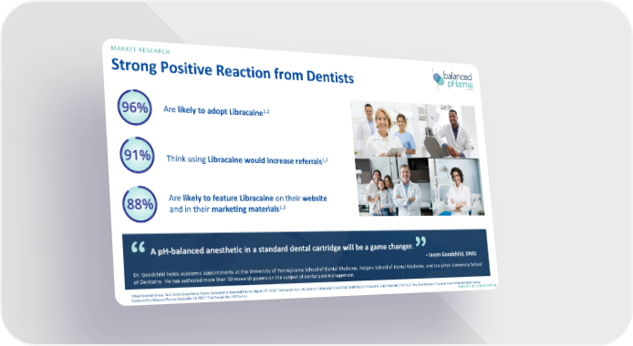 MARKET RESEARCH Strong Positive Reaction from Dentists 1,2 Are likely to adopt Libracaine Think using Libracaine would increase referrals1,2 Are likely to feature Libracaine on their website 1,2 and in their marketing materials A pH-balanced anesthetic in a standard dental cartridge will be a game changer. “ “ - Jason Goodchild, DMD Dr. Goodchild holds academic appointments at the University of Pennsylvania School of Dental Medicine, Rutgers School of Dental Medicine, and Creighton University School of Dentistry. He has authored more than 50 research papers on the subject of dental pain management. 1 th 2 3 Olson Research Group, “U.S. Dentist Quantitative Report, Conducted For Balanced Pharma, August 13 , 2021,” Total Sample Size: 181 Dentists; LIBRACAINE HAS NOT BEEN APPROVED BY FDA AND IS NOT AVAILABLE FOR SALE; Key-Stone Research, “European Local Anesthetics Market Survey, Conducted For Balanced Pharma, September 20, 2021,” Total Sample Size: 433 Dentists. PRIVATE & CONFIDENTIAL