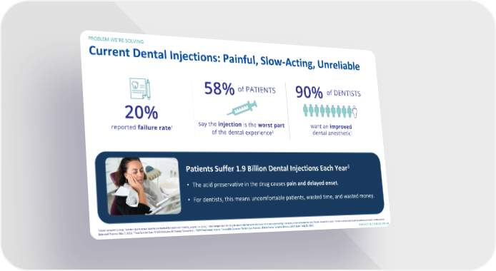 PROBLEM WE’RE SOLVING Current Dental Injections: Painful, Slow-Acting, Unreliable Patients Suffer 1.9 Billion Dental Injections Each Year3 • The acid preservative in the drug causes pain and delayed onset. • For dentists, this means uncomfortable patients, wasted time, and wasted money. 1 2 Olson Research Group, “Dentist Quantitative Report, Conducted for Balanced Pharma, August 13, 2021,” Total Sample Size: N=181; Balanced Pharma products have not been approved by FDA and are not available for sale; Olson Research Group, “Patient Dental Care Study Quantitative Report, Conducted for Balanced Pharma, May 7, 2021,” Total Sample Size: N=140 (Includes 40 Parents/Caregivers); 3SDM Northcoast report, “Injectable Carpules Market Size Analysis, United States, Canada, Mexico, 2019 Units”, July 15, 2021. PRIVATE & CONFIDENTIAL