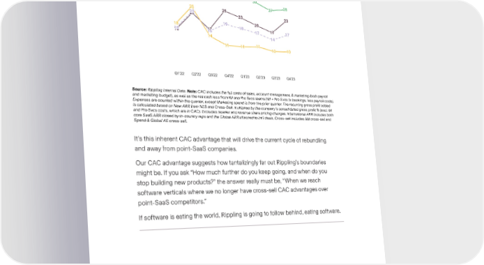 Source: Rippling Internal Data. Note: CAC includes the full costs of sales, account management, & marketing (both payroll and marketing budget), as well as the net cash loss from IM and Pro Svcs teams (IM + Pro Svcs 1x bookings, less payroll costs). Expenses are counted within the quarter, except Marketing spend is from the prior quarter. The recurring gross pro昀椀t added is calculated based on New ARR from NLS and Cross-Sell, multiplied by the company’s consolidated gross pro昀椀t % (excl. IM and Pro Svcs costs, which are in CAC). Excludes reseller and revenue share pricing changes. International ARR includes both core SaaS ARR closed by in-country reps and the Global ARR attached to int’l deals. Cross-sell includes AM cross-sell and Spend & Global AE cross-sell. It’s this inherent CAC advantage that will drive the current cycle of rebundling and away from point-SaaS companies. Our CAC advantage suggests how tantalizingly far out Rippling’s boundaries might be. If you ask “How much further do you keep going, and when do you stop building new products?” the answer really must be, “When we reach software verticals where we no longer have cross-sell CAC advantages over point-SaaS competitors.” If software is eating the world, Rippling is going to follow behind, eating software.