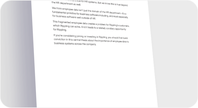Introduction Rippling’s one underlying insight is that most business systems are full of information about employees. Everyone knows that’s true for HR systems. But we know this is true beyond the HR department as well. We think employee data isn’t just the domain of the HR department—it’s a fundamental primitive for business software including, and most especially, for business software well outside of HR. This fragmented employee data creates a problem for Rippling’s customers, which Rippling can solve. And it leads to a related, corollary opportunity for Rippling. If you’re considering joining or investing in Rippling, you should 昀椀rst build conviction in this central thesis about the importance of employee data to business systems across the company.