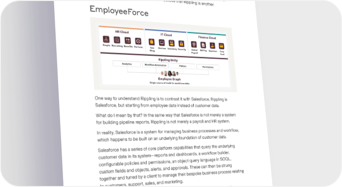 advantages of deep systems integration and bundled contracting and pricing will begin to re-dominate. And then, a new wave of cloud-native mega-vendors is going to emerge. One of these companies, clearly, is Salesforce. I believe that Rippling is another. EmployeeForce One way to understand Rippling is to contrast it with Salesforce. Rippling is Salesforce, but starting from employee data instead of customer data. What do I mean by that? In the same way that Salesforce is not merely a system for building pipeline reports, Rippling is not merely a payroll and HR system. In reality, Salesforce is a system for managing business processes and work昀氀ow, which happens to be built on an underlying foundation of customer data. Salesforce has a series of core platform capabilities that query the underlying customer data in its system—reports and dashboards, a work昀氀ow builder, con昀椀gurable policies and permissions, an object query language in SOQL, custom 昀椀elds and objects, alerts, and approvals. These can then be strung together and tuned by a client to manage their bespoke business process relating to customers, support, sales, and marketing. Salesforce is useful to companies both because of this con昀椀gurable Platform toolset—companies need reports and they need work昀氀ow tools—but also because these tools have a built-in understanding of the company’s customers.