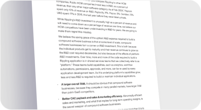 While our R&D spending as a percent of revenue is coming down over time, it’s multiple standard deviations away from the mean in comparison to our public peer group. It’s particularly anomalous when you compare Rippling to other HCM companies. Public HCM companies invest less in R&D, as a percent of 4 Paycom revenue, than any other major software category. As of Feb 2024, spent only 10% of revenue on R&D. Paylocity, 11%. Paycor, 9%. Ceridian, 13%. UKG spent 17% in 2018, the last year before they were taken private. While Rippling’s R&D investment is unusually high as a percent of revenue and will need to come down as a percentage of revenue over time, we believe our HCM competitors have been underinvesting in R&D for years. We are going to make them regret this misstep. We believe the saving grace of the upfront R&D expense required to build a compound software business is that at some level of scale, compound software businesses turn a corner on R&D investment. This is both because the individual products get to maturity and their revenue continues to grow as the R&D cost required decelerates, but also because of the effects of platform R&D investments. Over time, more and more of the code required to build a Rippling application is in shared services teams that we collectively refer to as “platform.” These teams build capabilities, such as analytics, work昀氀ow automations, permissions, approvals, and more, can be re-used by every application development team. As this underlying platform’s capabilities grow, less and less R&D is required to build or maintain individual applications. • A larger overall TAM. It should be obvious that compound software businesses, because they compete in many parallel markets, have larger TAM than point-SaaS competitors. • Better CAC payback and sales & marketing ef昀椀ciency. Abnormally ef昀椀cient sales and marketing, and what that implies for long-term operating margins, is the secret weapon of compound software businesses. It’s a lot harder to acquire a new customer relationship (a new logo) than it is to sell a new, adjacent product to a happy customer. But almost all SaaS companies are operating in impossible mode, selling a single product to a brand new customer every time. Compound software 4 Source: CapIQ. Note: All peer metrics based on the most recently reported last twelve months (as of 02/20/24), except UKG, as noted. These metrics exclude stock-based comp.