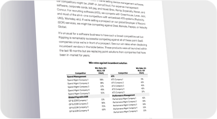 within a company and because employee data is such an important primitive for the rest of Rippling, we are usually (but not always) ripping out one of these existing vendors when we win a new client. But our competitive set is broader. If we’re selling device management software, our competitors might be JAMF or JumpCloud. For expense management software, corporate cards, bill pay, and travel: Brex, Ramp, Expensify, Navan, and Concur. For recruiting software (ATS), we compete with Greenhouse, Lever, Jazz, and most of the all-in-one competitors with embedded ATS systems (Paylocity, UKG, Workday, etc). If we’re selling a prospect on our global Employer of Record (EOR) services, we might be competing against Deel, Remote, Papaya, or Velocity Global. It’s unusual for a software business to have such a broad competitive set but Rippling is remarkably successful competing against all of these point-SaaS companies once we’re in front of a prospect. See our win rates when displacing incumbent vendors in the table below. These products were all launched within the last 18 months but are replacing point solutions from companies that have been in-market for years.1 1 Source: Rippling Internal Data. Financial 昀椀gures are under review and subject to change. Note: Win Rates are based on situations where we are displacing an incumbent solution (i.e. it excludes green昀椀eld sales). The 昀椀gures in the table above include both NLS (Stage 3) and XSell (Stage 4). Based on external benchmarking with HR peers and other SaaS companies, we believe these opportunity stages are equivalent to the stages most software companies benchmark their win rates. NLS Stage 3 and XSell Stage 4 are de昀椀ned as the opportunity has a strong 昀椀t, with speci昀椀c product interest and a demo has been completed—it is intended to qualify a “live deal” where there is an active evaluation by a potential buyer and explicitly excludes initial 昀椀rst calls/demos where there is no active buying process—e.g. a company takes an initial call or demo for a gift card, but has no intent to switch systems. All opportunity information is based on Salesforce data, where we are replacing an incumbent solution and the competitor is tagged by the sales representative. There are situations where we do not have competitor info— the two most prominent reasons are (1) not all opportunities replace an incumbent solution and (2) sales reps do not always note the name of the incumbent competitor. This data also relies upon the information that our sales representatives enter into Salesforce and their pipeline management hygiene—while we enforce this on a best efforts basis, it is likely imperfect.